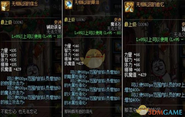 新左槽名为无相轮回的信念,属性是增加500px范围内队员50点三攻。新右槽名为无相轮回的眼泪,属性是增加500px范围内队员10点全属性强化。新耳环名为无相轮回的追忆,属性是可以使500px范围内的队友增加400的HP和MP上限。