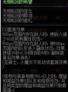 特殊装备三件套套装名为无相轮回的希望,属性是减少500px范围内敌人10点全属性抗性,在500px范围内有人时给500px范围内的队友附加霸体状态,效果持续30秒(冷却时间35秒)。
