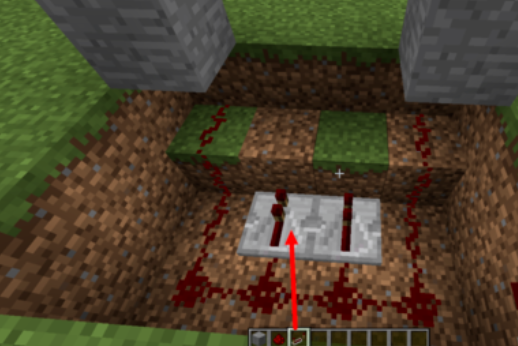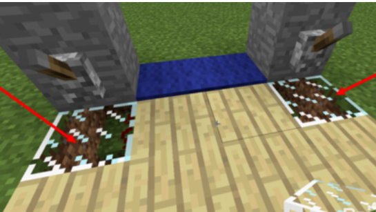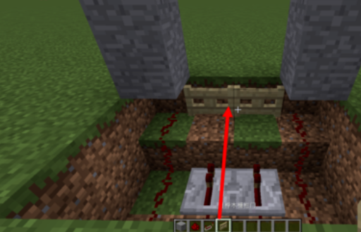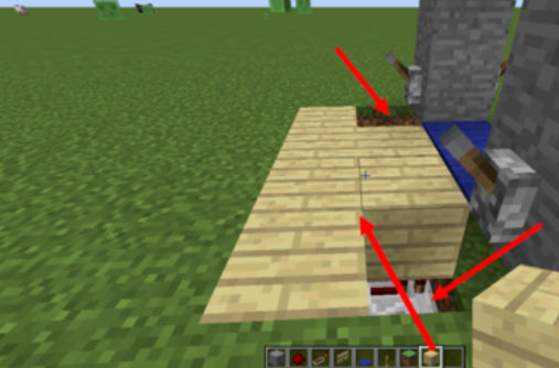 4,在两排红石的中间放上两个红石中继器,方向要对着门。