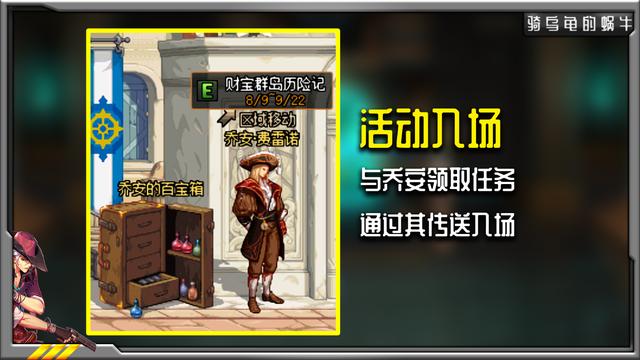 活动开始后,活动NPC乔安并不在赛丽亚房间,而是在西海岸魔法师公会左边的固定位置,与乔安领取活动任务后,可以进入财宝群岛。