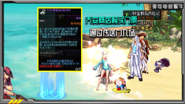 进入财宝群岛后,在NPC乔安商店购买【航海券】作为副本入场门票,每周可以购买9个,但每天只能入场3次,建议一次性购买,每周花3天时间完成活动。