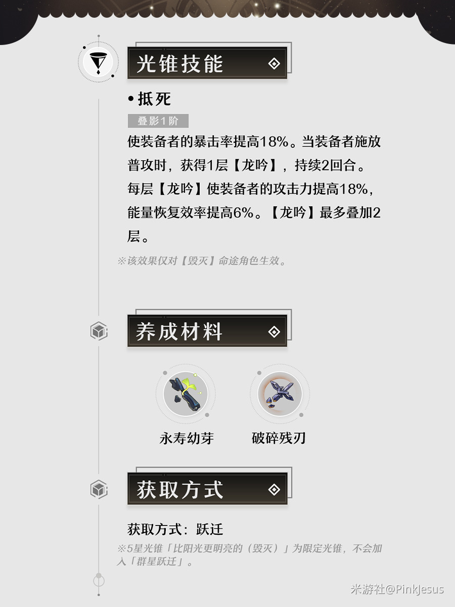 相当优秀的攻击力,目前毁灭光锥第一,同时为饮月君量身定做的特效提升分别提升了暴击率、攻击力和能量恢复效率,也就是说,饮月最为需求的光锥提升就是这三样,而这会影响到我们的下位替代光锥使用考虑以及内圈仪器的连接绳选择