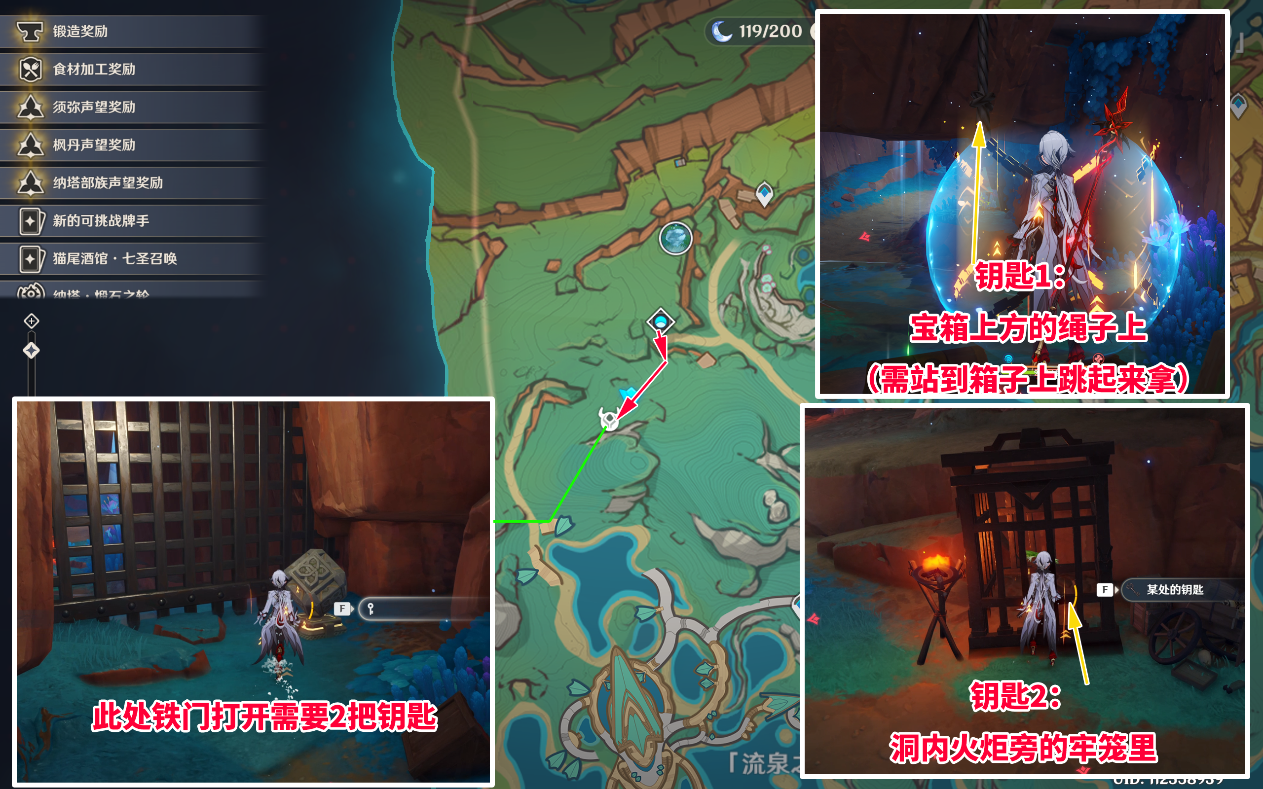 钥匙1:在宝箱上方的绳子上(站到箱子上跳起来拿)