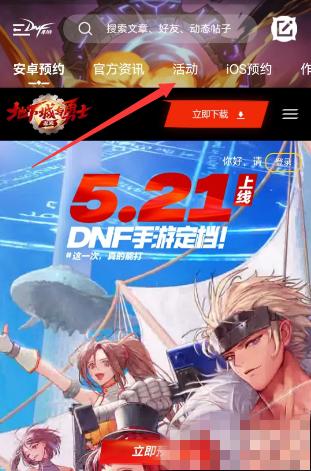 1、用户除了直接点击上述入口外,还可以登录【DNF助手】,在首页点击顶部的【活动】。