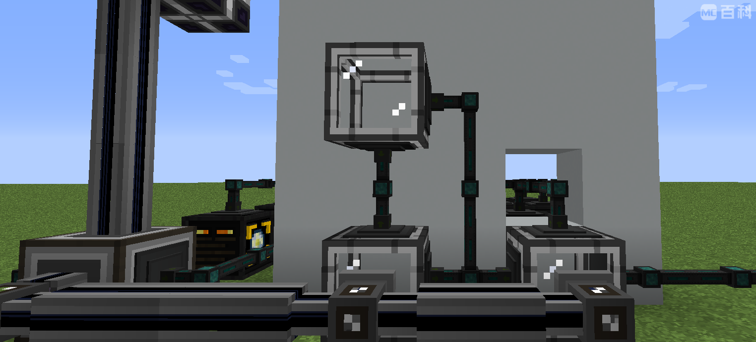 为了在合成铁,金时不会把所有材料全部合成掉,我们用加了容量卡的ME输出总线向分子装配室中输出材料,这样永动机循环中就不会有可以让物品缓冲的区域,下图为了可以看得更清楚,加了一堵白墙。