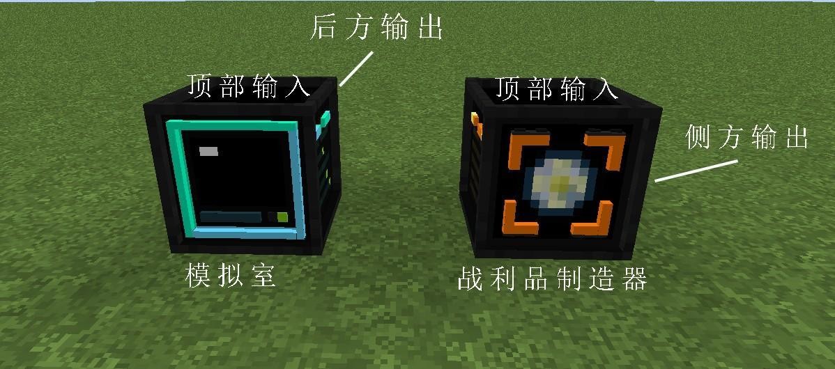 战利品制造器顶部输入原始物质,侧方输出,注意要在战利品制造器顶部导管接口放入物品过滤器,使三个战利品制造器各转换一种原始物质。