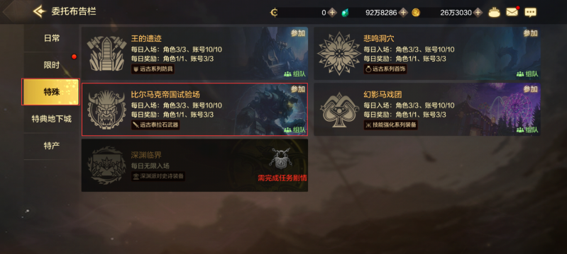 副本的进入等级为50级,打开主页面右侧的【委托】,选择【比尔马克帝国试验场】即可进入。可以在通关可掉落材料【闪亮的泰拉石】,更有一定几率掉落成品神器装备、附魔卡片。