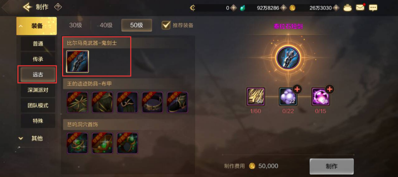 没有爆出职业适配的武器的话,可以在打造-制作-装备-远古栏当中收集【闪亮的泰拉石】直接指定制作50级的神器泰拉石系列武器。