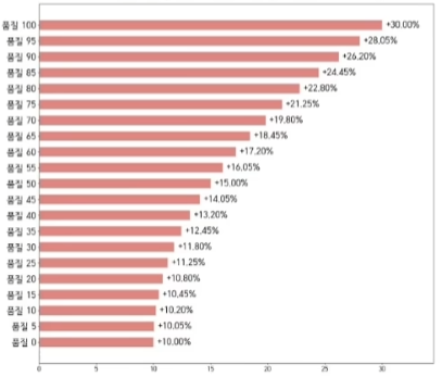 我们可以看到在0~5品质只上升0.05%的伤害而95~100品质上升了接近2%的伤害。但一件装备的品质上升到100是很难的,所以除开武器外升级防具的品质也是需要的,最好能在70品质左右是比较有性价比。