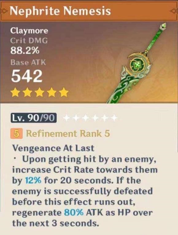 主属性为加攻击和暴伤,副属性:角色受到敌人攻击后,获得复仇效果,对这些敌人的暴击率提升6%(满精12%),持续20秒。效果持续期间,角色击败敌人时,每秒恢复等同于攻击力40%(满精80%)的生命值,持续3秒。