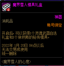 DNF魔界雪人模具礼盒开启后,可以获得1个灵魂武器自选礼盒和1个林纳斯的秘传模具,可以用来进行武器幻化,而且灵魂武器自选礼盒比较难获得,建议给需要武器幻化的职业开启。