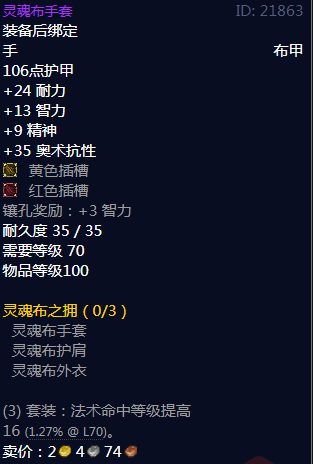 灵魂布手套属性,装备后绑定,手布甲,106点护甲,+24耐力,+13智力,+9精神,+35奥术抗性,黄色插槽,红色插槽,镶孔奖励:+3智力,耐久度35/35,需要等级70,物品等级100。