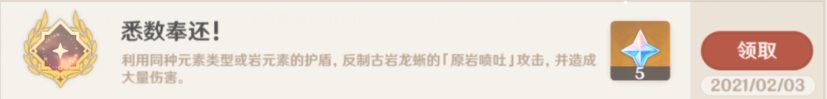 原神1.3版本悉数奉还隐藏成就达成的方法是:使用与古岩龙蜥相同元素类型护盾,反制古岩龙蜥的原岩喷吐攻击,推荐队伍中携带主动产生护盾人物或武器,任务开始前注意观察古岩龙蜥的相应元素类型,在古岩龙蜥发动原岩喷吐时启动相应元素护盾防御即可。