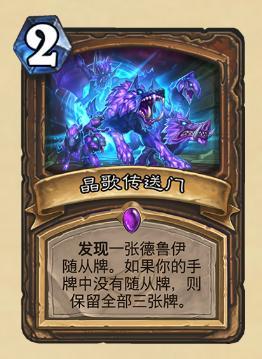 2费发现一张德鲁伊随从牌,如果手中没有随从,则保留3张。发现德鲁伊随从卡:职业卡,还是发现3选1,肯定不会差。而手中没随从的时候,还可以一次补3张,笔者认为这张卡其实不错,因为只要不是随从超多的德鲁伊套路,都是有机会拿3张的,就很赚,即便手中老有随从,那便等后期用,只发现一个也无妨,塞纳留斯等卡还是很强的。这张卡目前笔者看来树人德最适合带,因为相对法术占比高,那么拿3张的概率就高。对于快攻德而言,因为没有回血效果,加上2费找牌属于亏节奏行为,所以个人以为不适合快攻德。