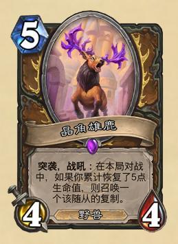 5费4/4突袭(野兽属性装作看不到,嘘……)战吼:本局游戏中,累积回复了5点生命值,则召唤一个该随从的复制,回复5点包括给随从的奶,给英雄的奶,所以触发还是很容易的,即便没有其他奶,直接水晶之力奶一下不就OK了,6费2张卡,回5血,并召唤2个4/4突袭,一样稳赚。从这个角度看,水晶之力这张卡的需求真的极高,各种combo!