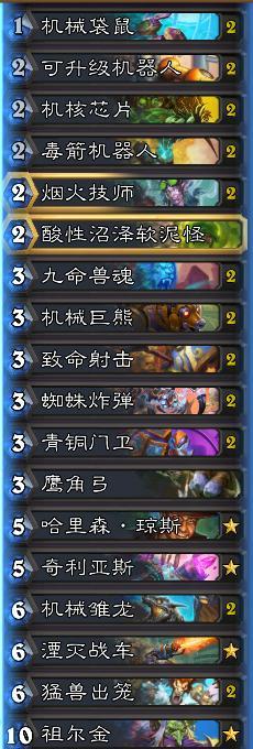 我加入了2张致命射击,用来解很多大怪都是挺赚的,像术士的山岭、盗贼的大范等都是蛮常见的,二来还可以配合祖尔金使用,毕竟致命射击只会消灭敌方的随从。我加入了2张毒箭机器人,由于自带磁力,所以也是可以经常解掉很多棘手的随从。除此之外我还带了一把鹰角弓,算是弥补下没直伤吧,用来解场或打脸都是可以的。
