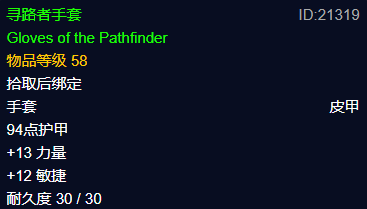 一件绿色手套直接暴力增加13力量12敏捷,非常契合近战物理职业,尤其是近战猎人,简直是完美。它也理所当然是当前阶段近战猎的毕业手套!这个阶段的近战猎依旧是DPS的扛把子,可不能少了这件装备哦!