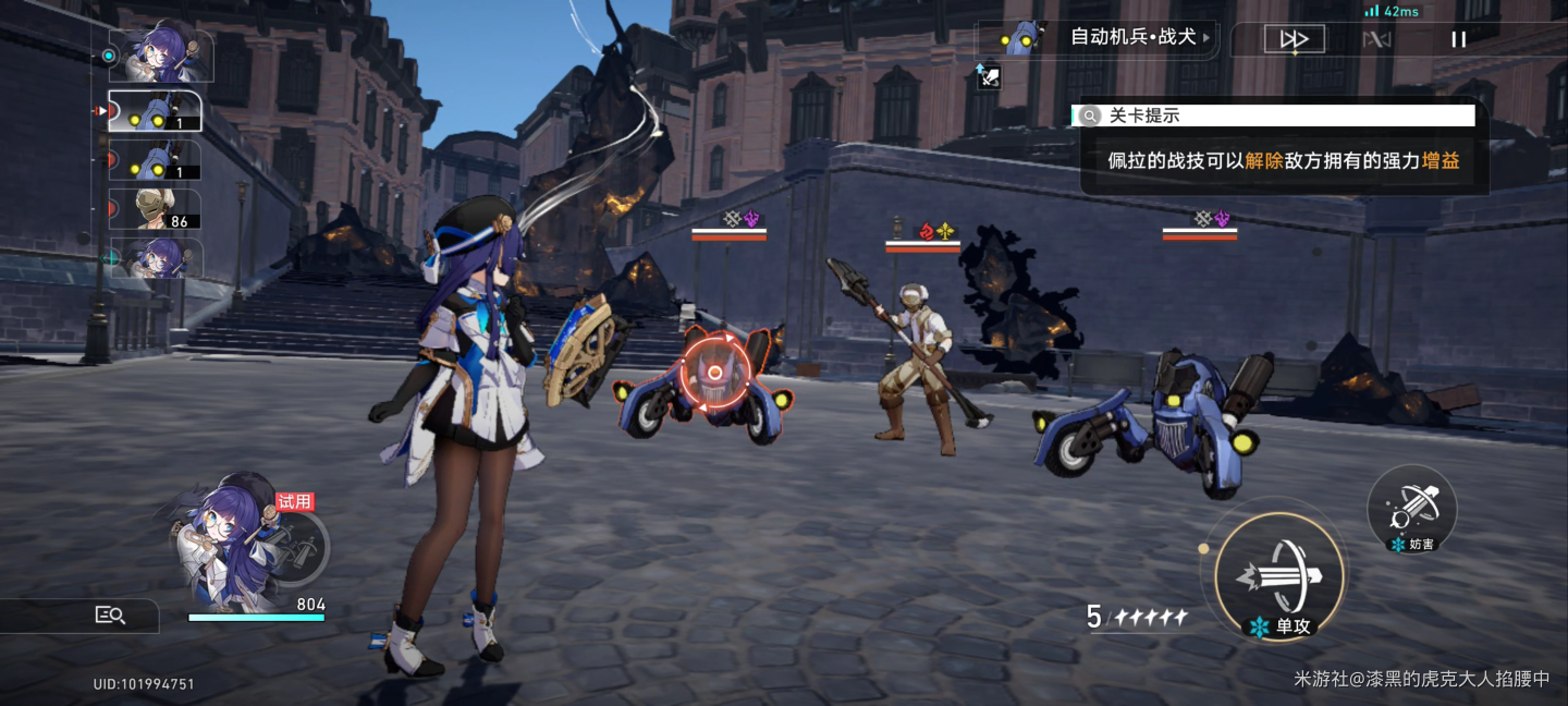 佩拉【冰】,佩拉的出场率好高,这场战斗,站在中间的人行敌人会对某个机器人施加增益效果,而佩拉需要使用战技攻击对应机器人,使其增益效果消失。