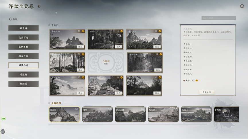 【闲涉丹青】:根据浮世全览卷的图片提示找到绘制丹青的位置,到达后与卷轴进行交互,找到合适的角度,即可完成