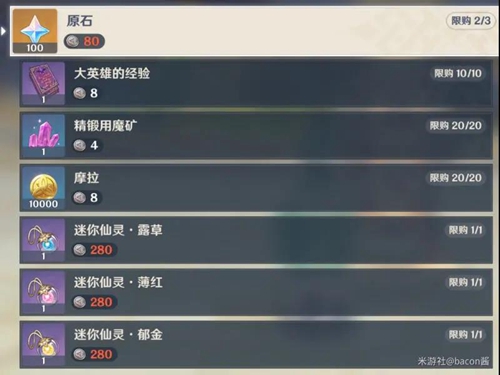 原石>迷你仙灵(露草/郁金/薄红)>经验书>武器矿>摩拉