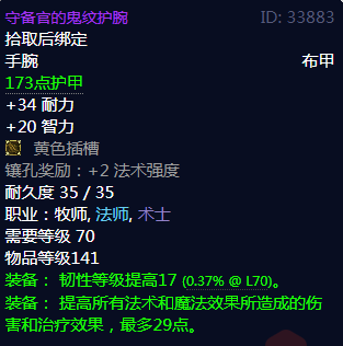 守备官的鬼纹护腕属性,拾取后绑定,手腕布甲,173点护甲,+34耐力,+20智力,黄色插槽,镶孔奖励:+2法术强度,耐久度35/35,职业:牧师,法师,术士,需要等级70,物品等级141,装备:韧性等级提高17(0.37%@L70)。装备:提高所有法术和魔法效果所造成的伤害和治疗效果,最多29点。