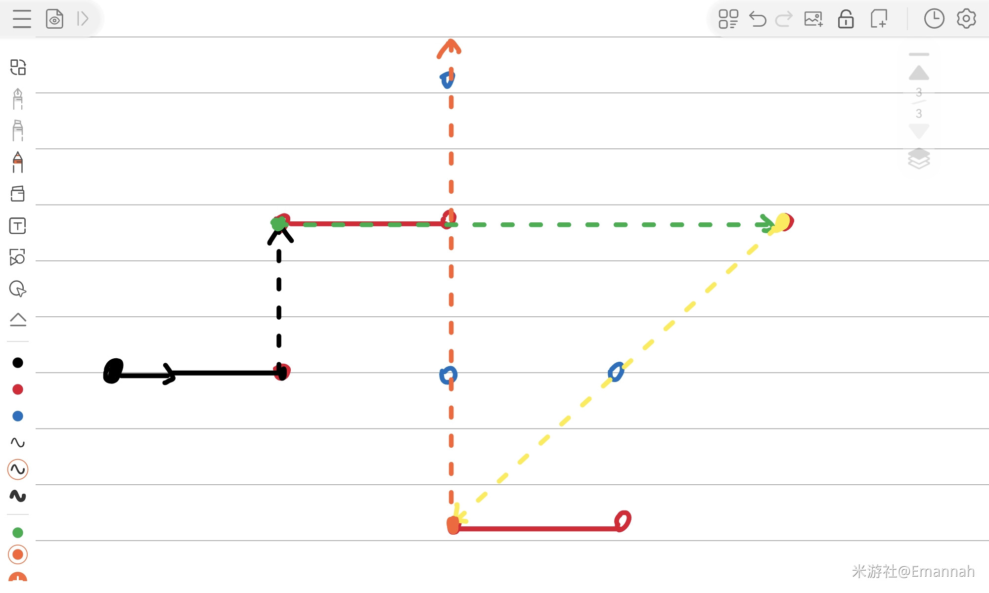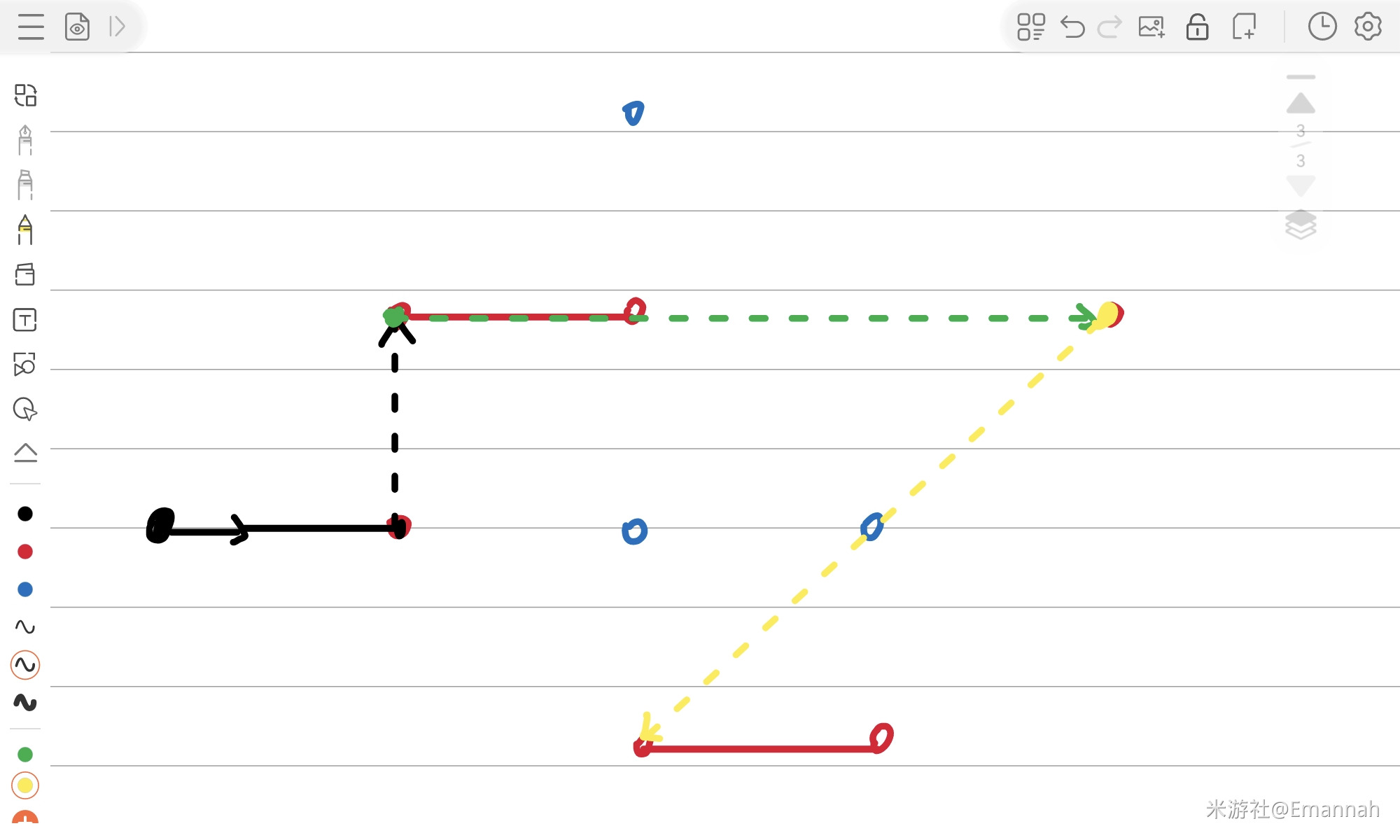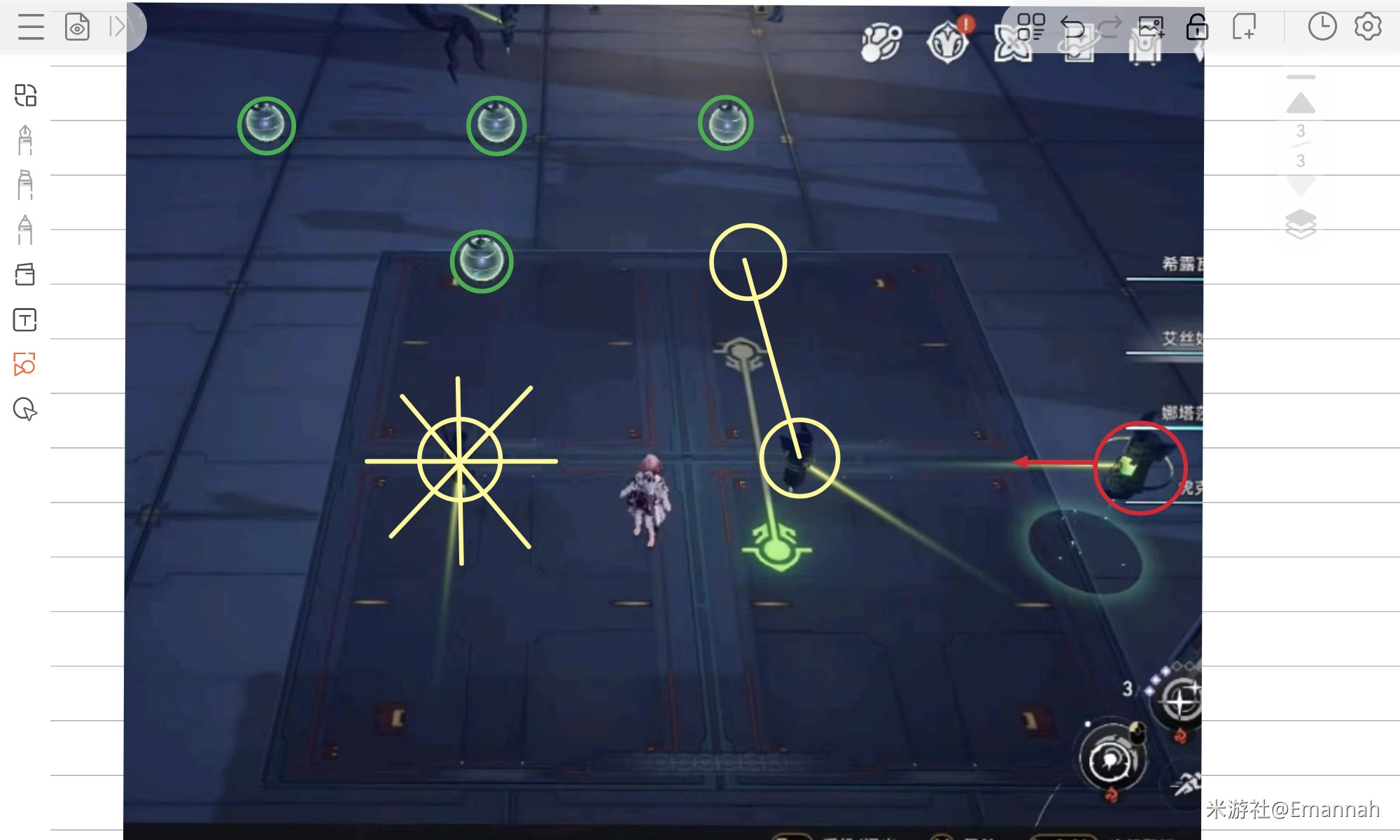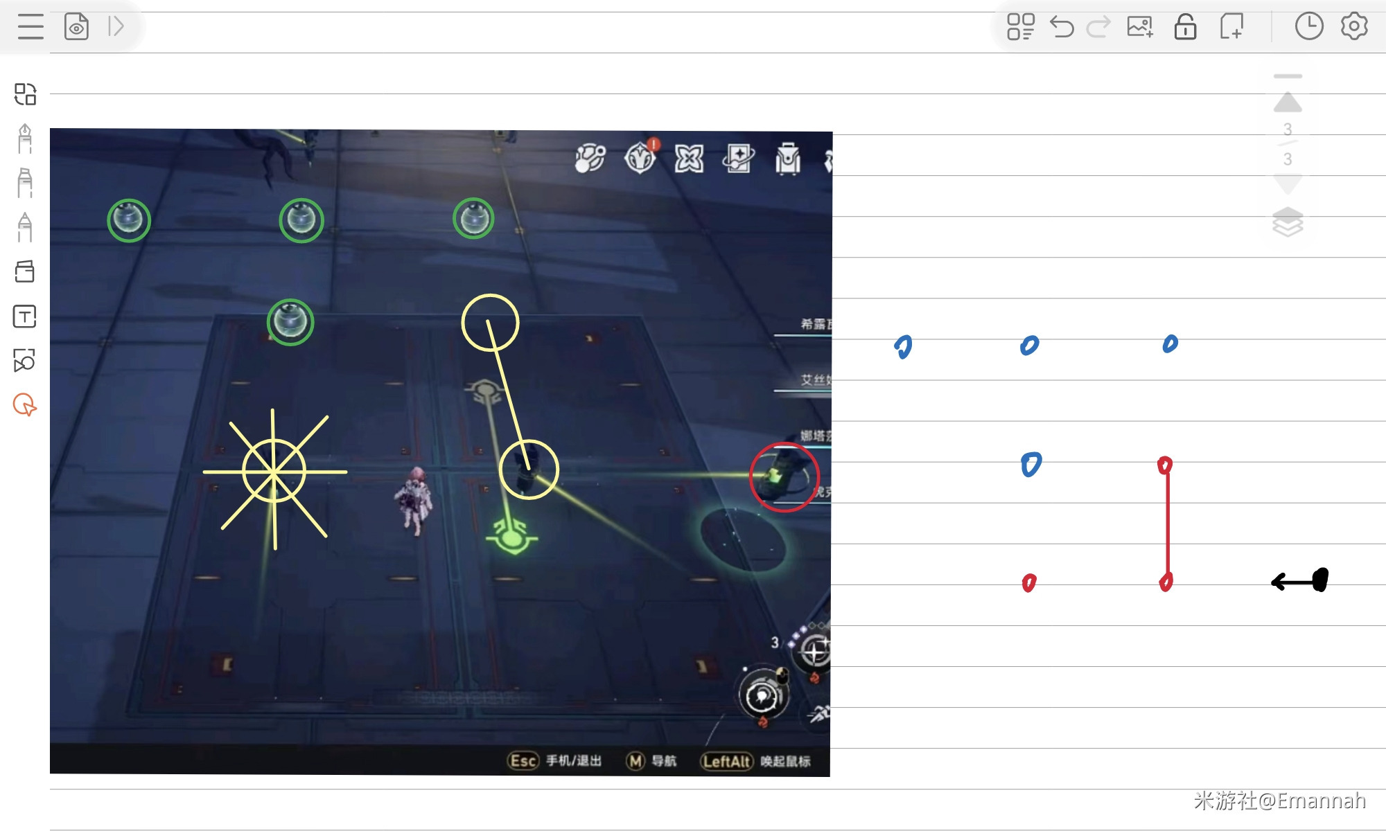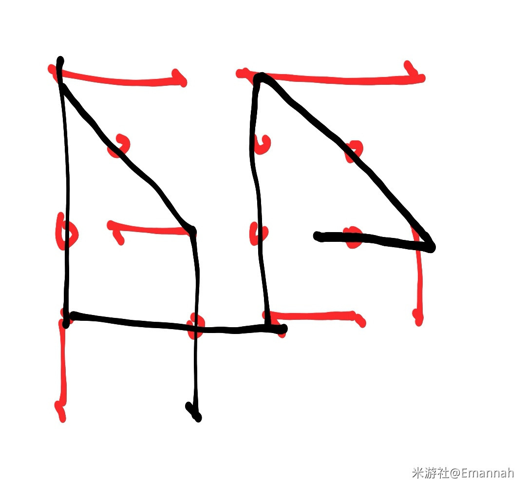 由于游戏内视角十分诡异,很难看清,我们可以将所有元素转化为右边的俯视角简笔画,这样更好理解。