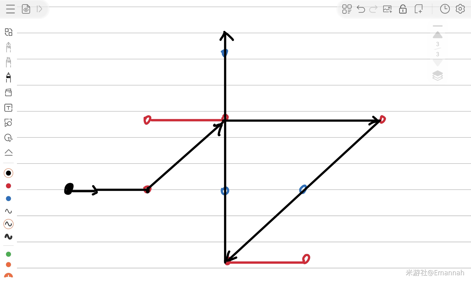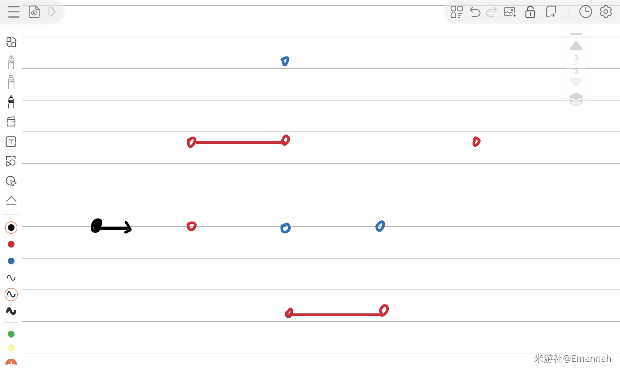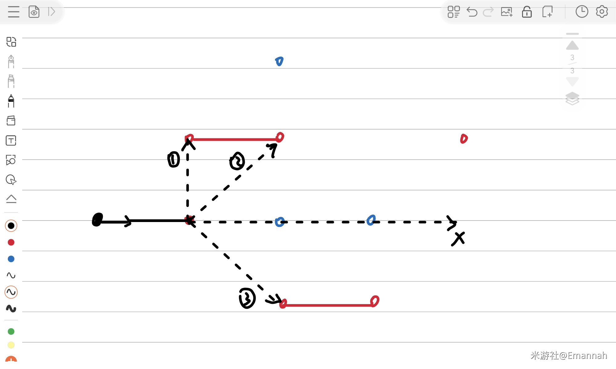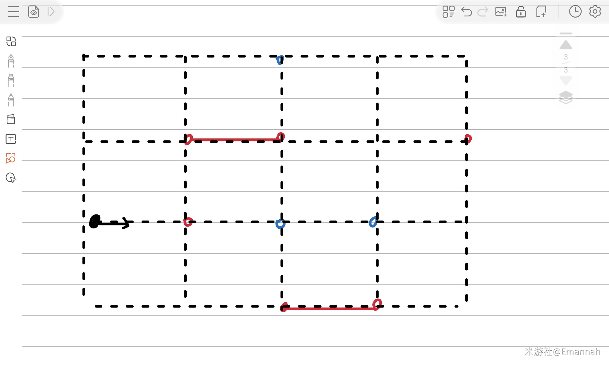 随机抽取一个关卡,下图是它转化后的样子。由于换了颜色,再次强调一遍目标:从黑色的射线出发,经过所有红点,使射线穿过所有蓝点。