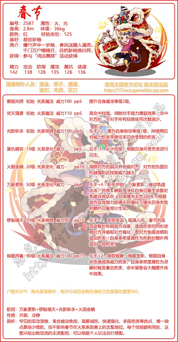 简析:罕见的双攻宠物,集合被动免控、高额减伤、快速强化、多段伤害等优点,唯一缺点是缺少续航,但不影响春节在火系系别赛上的支配地位。每个技能都有用处,这里只给出物攻流的主流配招,可以根据个人玩法自行搭配。