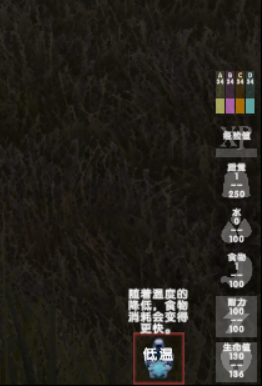 维生素,随时间消耗,进食补充。经验值,采集,战斗,消化,探索等均可增加经验值。负重值,背包物品和人物身上装备的重量总和,较高的时候会降低移动速度,过高的时候会丧失跳跃能力。口渴值,用处是恢复耐力。饥饿度用途是恢复生命值和耐力。耐力用途按住shift加速跑。生命值用途为活着。