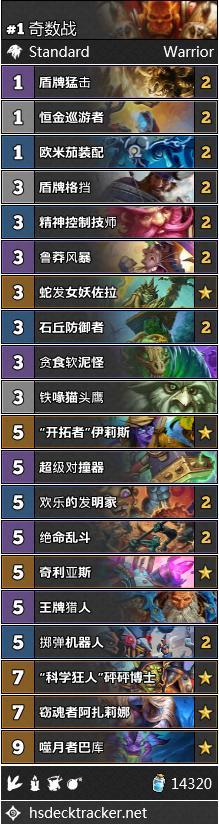 玩家们在轰轰烈烈的尝试机械战后,纷纷倒戈向其他职业,3费炽炎战斧的阴影仍然笼罩着加尔鲁什。而机械体系,对于传统防战和奇数战的后期有了大大补强,不再是资源耗光转甲空过耗疲劳,可以用机械随从去解场甚至打伤害,由于奇数战非常考验玩家对天梯主流套牌的理解,以及有充足的实战经验,因此并不推荐使用这种慢速战士作为上分首选。至于奇数战的细节教学,可以详见狗贼的直播录像(此条免费)。