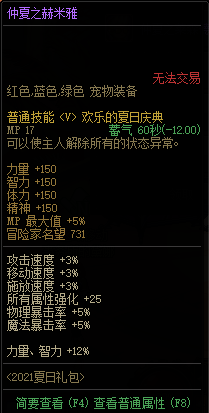 DNF仲夏派对宠物自选礼盒开启后,可以从2种仲夏派对宠物中,选择获得1个。获得的宠物无法交易,可以永久使用。2个宠物属性一样,一个是加12力量智力,一个是加12%附加伤害。