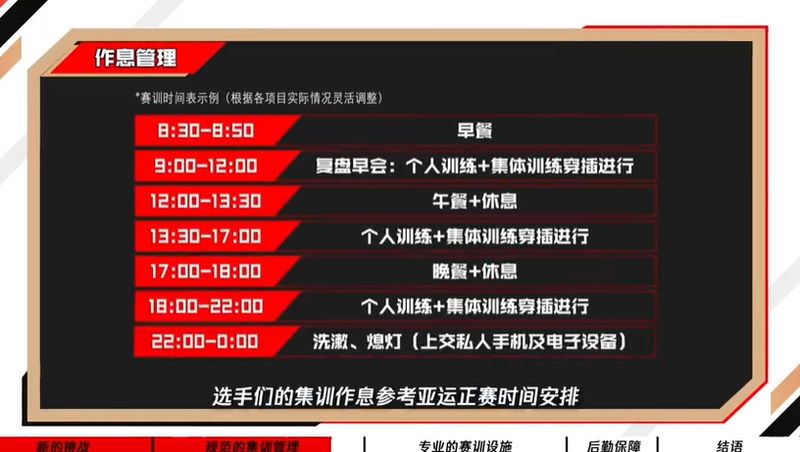 今日腾讯电竞公布亚运会选手集训作息表:每天8.30起床吃早餐,随后开赛训练至中午十二点吃午餐,下午13.30开始训练至17点开始晚餐,晚上18点开始训练至22点准备洗漱、熄灯(并且要上交手机和电子设备)。