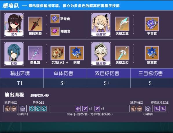 北斗菲谢尔提供雷,行秋提供水进行感电反应,核心伤害为班尼特加持下三角色脱手伤害。可惜是行秋处于后台时不能获得班尼特加成,因此对单目标时更推荐行秋站场,让行秋Q能够吃到班尼特加成。感电反应同超载,可以造成硬直控怪,提供更好输出环境。