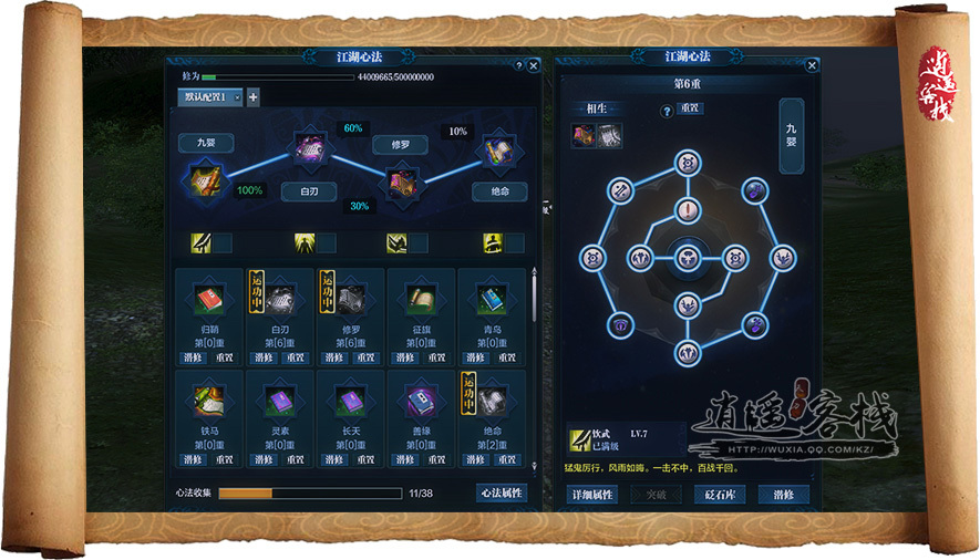 《悲回风》主外功、力道、洞察,是神刀刷图的标准心法,必用。