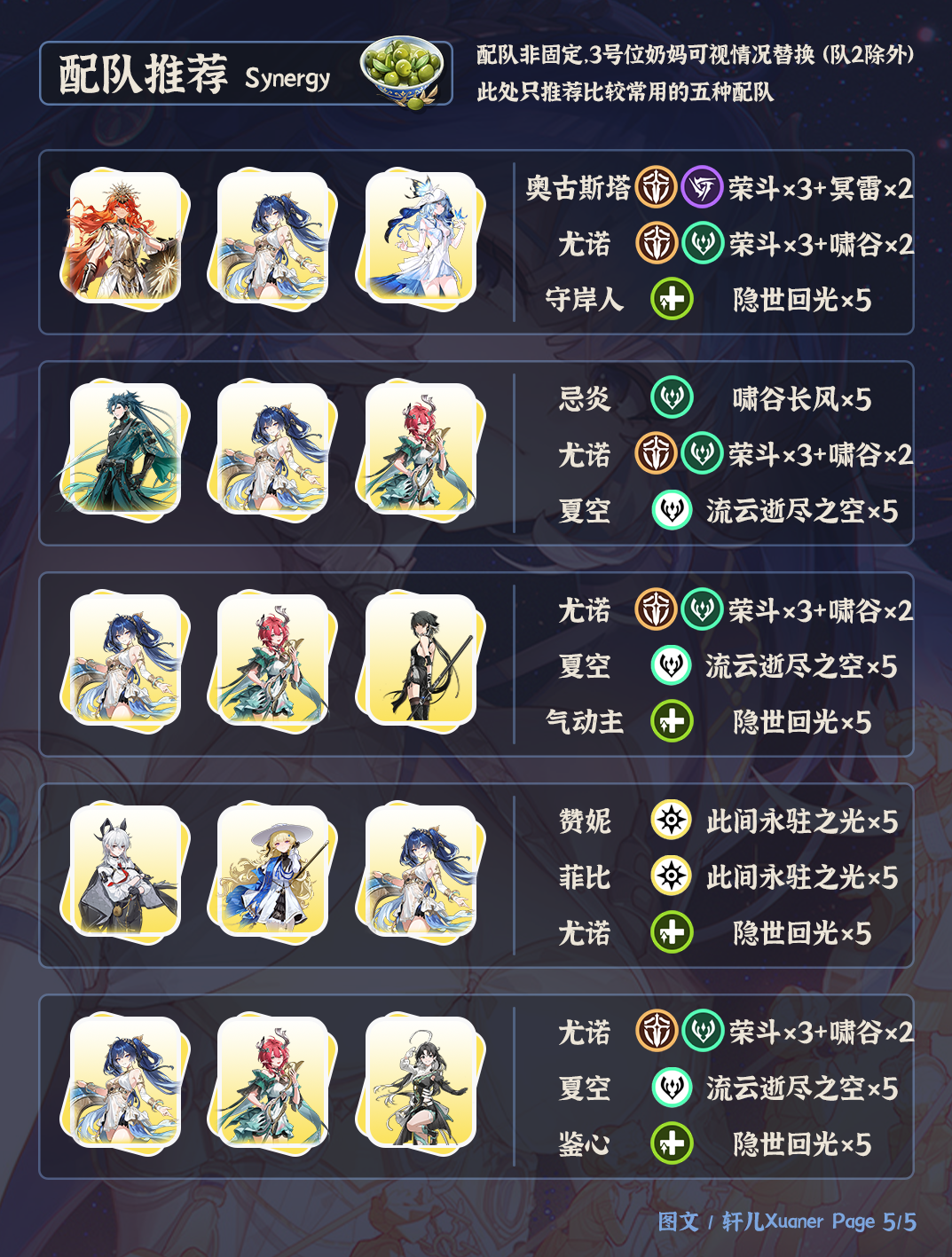 ⑤ 尤诺延奏可以提供重击伤害加成,加上共鸣回路增伤机制,与奥古斯塔最为适配。其余队伍可考虑搭配忌炎或赞菲吃重击加成,忌炎尤诺队第三人优先使用夏空,优于守岸人/气动主。尤诺做主C,主要与夏空搭配,第三人气动主优先,其次鉴心或守岸人。