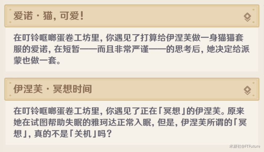 在角色逸闻中遇到「爱诺·猫,可爱!」和「伊涅芙·冥想时间」这两个剧情时,可在剧情中分别获得1个「蛋卷螺栓」。