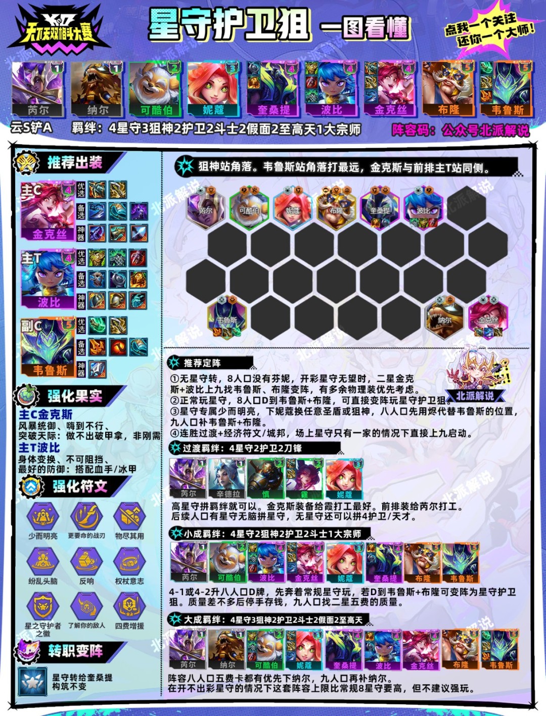 唯一问题是即需要在八人口和星守抢卡,又需要五费韦鲁斯和布隆,成型难度非常高,建议在以下情况玩:①无星守转,8人口没有芬妮,开彩星守无望时,二星金克斯+波比上九找韦鲁斯、布隆变阵,有多余物理装优先考虑。②正常玩星守,8人口D到韦鲁斯+布隆,可直接变阵玩星守护卫狙。③星守专属少而明亮,下妮蔻换任意圣盾或狙神,八人口先用烬代替韦鲁斯的位置,九人口补韦鲁斯+布隆。④连胜过渡+经济符文/城邦,物理装备有一套半,场上星守只有一家的情况下直接上九启动。阵容构筑:芮尔、纳尔、可酷伯、妮蔻、奎桑提、波比、金克斯、布隆、韦鲁斯组成羁绊:4星守3狙神2护卫2斗士2假面2至高天1大宗师闭环羁绊