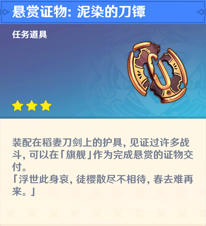 过完剧情后,我们获得一个「悬赏证物:泥染的刀镡」