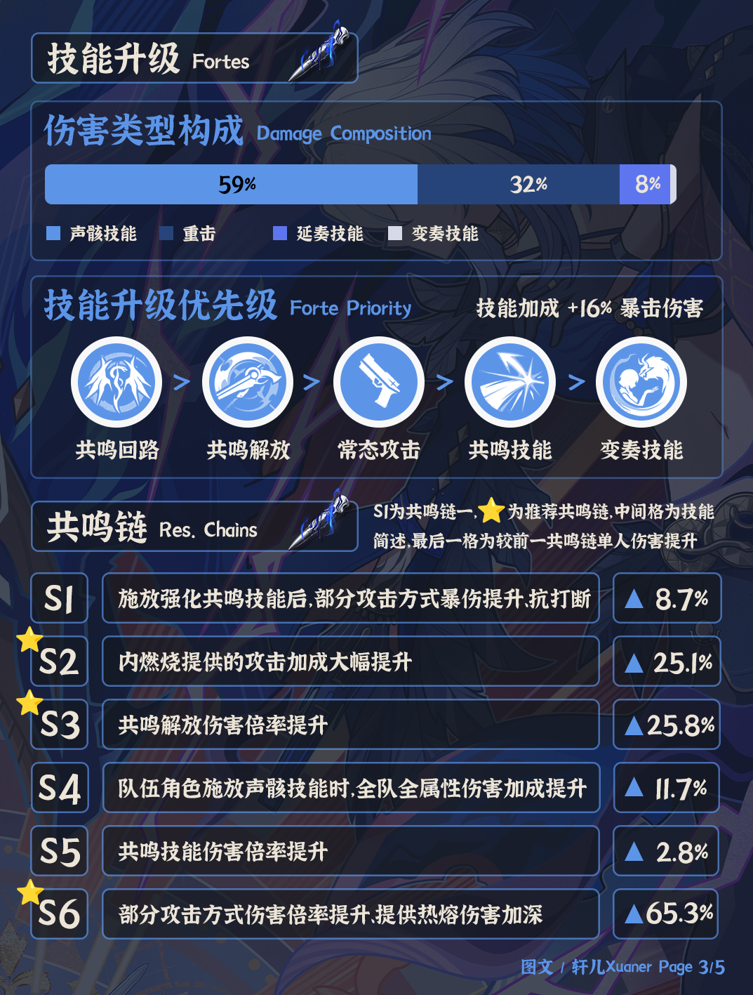 ③ 嘉贝莉娜主要输出类型为声骸技能伤害,其次是重击伤害。共鸣链推荐抽取2/3/6链,均为提升伤害共鸣链,6链提升巨大。