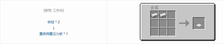铁质的压力板,当实体在重质测重压力板上面时,将对周围毗邻方块发出红石信号。