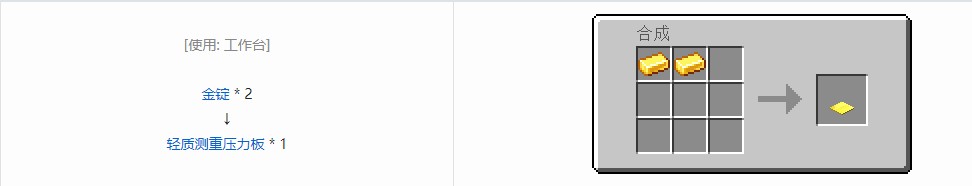 用金锭做的压力板,任何实体都能触发,输出的红石信号强度由上面的实体数量决定,最大强度不超过 15 级。每个实体输出1点红石能量(一个实体为1个生物或者是一组及以下的物品)