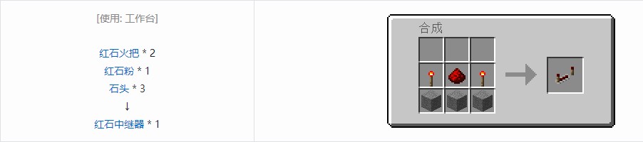 中继器有前侧与后侧之分——材质上的箭头指向的方向就是前侧。中继器上还有两个小红石火把——火把的颜色指示输出是否为开(输出关时为暗红色,开时为亮红色),两根火把之间的距离表示中继器在信号传输中产生的延迟。
