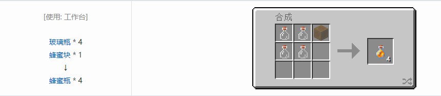 同时蜂蜜瓶可用于合成糖,1 个蜂蜜瓶能够合成 3 个糖(会留下空玻璃瓶)。