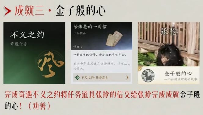 完成奇遇不义之约将任务道具张抢的信交给张抢完成成就金子般的心!(劝善)