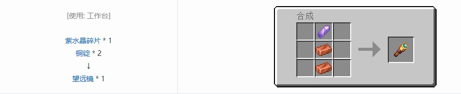 望远镜可以用1个紫水晶碎片和2个铜锭合成。