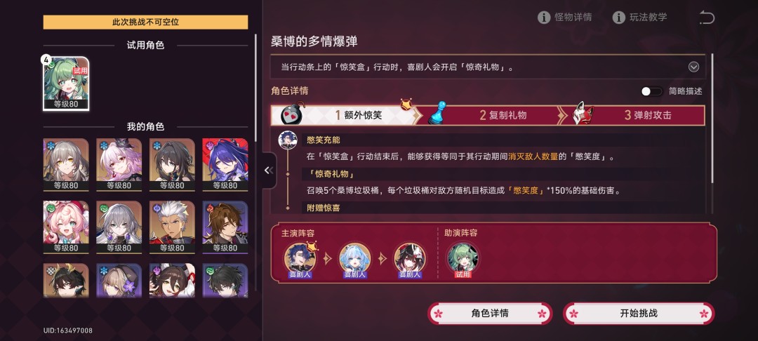 开始挑战,刻律为桑博赋予爵位,花火为桑博提供三次战技(不耗费战技点)使用机会,藿藿大招为桑博充能。