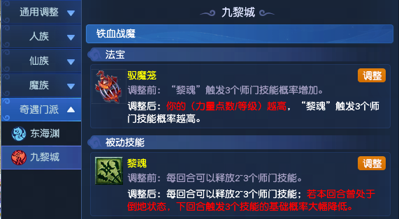 | 铁血战魔(被动技能) | 黎魂 | 每回合可以释放2-3个师门技能。 | 每回合可以释放2~3个师门技能;若本回合曾处于倒地状态,下回合触发3个技能的基础概率大幅降低。 |