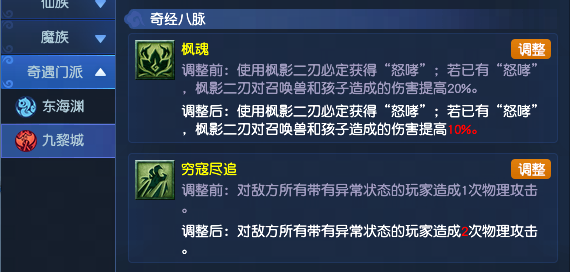 | 铁血战魔(奇经八脉) | 枫魂 | 使用枫影二刃必定获得“怒哮”;若已有“怒哮”,枫影二刃对召唤兽和孩子造成的伤害提高20%。 | 使用枫影二刃必定获得“怒哮”;若已有“怒哮”,枫影二刃对召唤兽和孩子造成的伤害提高10%。 |