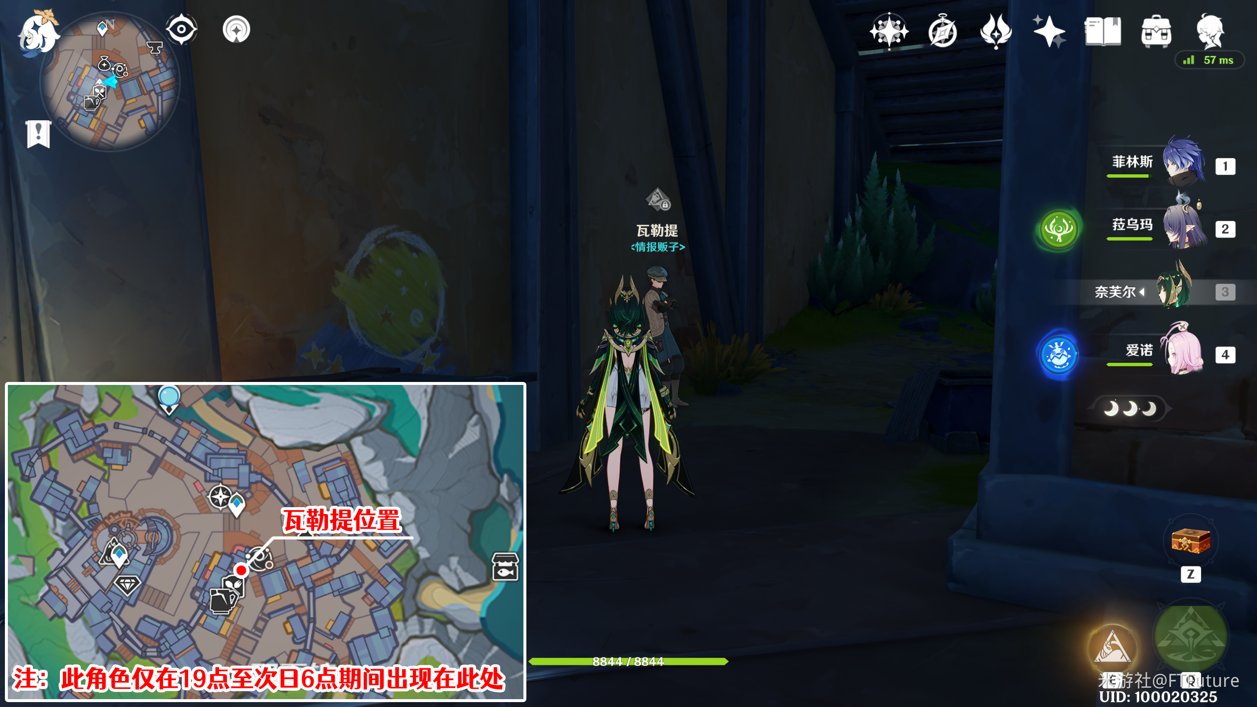 12. 瓦勒提:位于图示位置楼梯下方的狭窄空间中,此角色只在游戏内傍晚19:00到次日凌晨6:00这段时间内出现在这个位置,过去以后注意调整一下时间。
