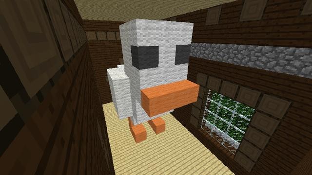 在这个房间内有一个巨大的鸡模型,鸡模型由三种羊毛组成,分别是:白色羊毛、橙色羊毛、灰色羊毛。还有地面是白桦木地板,之后整个房间内没有其他物品。